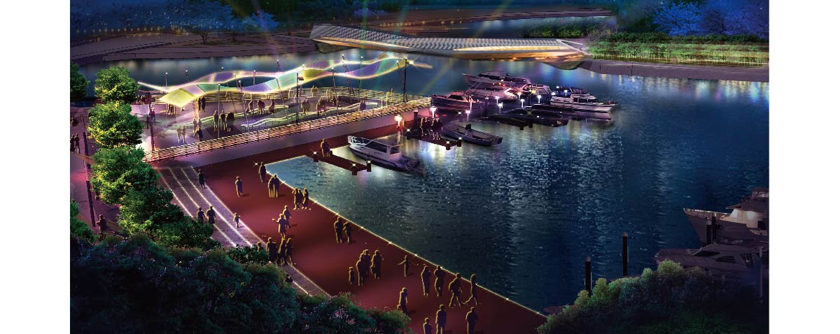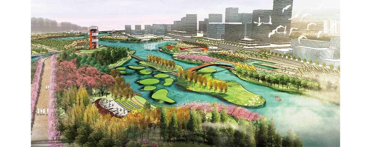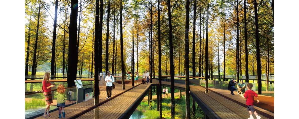 湿地公园位于长江下游北岸,是靖江新城滨江区域发展的催化项目。设计创造性的突破水网肌理,创建多元立体的活力“城市阳台”,运用海绵城市理念,营造适合当地风貌的滨水湿地公园,赋予基地新的标志性元素,形成新的城市名片。