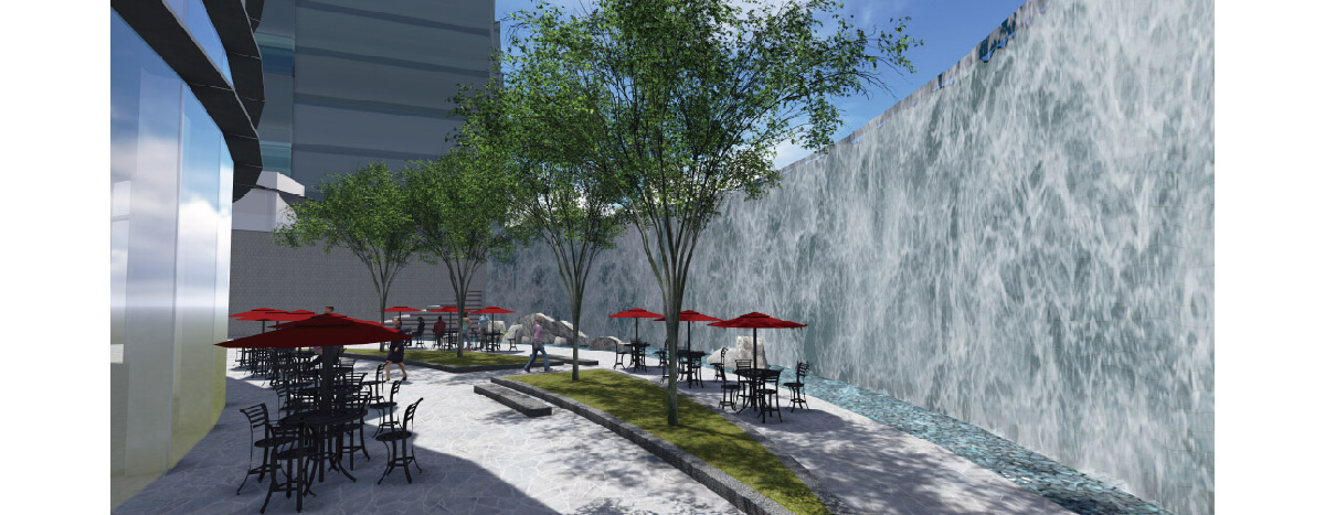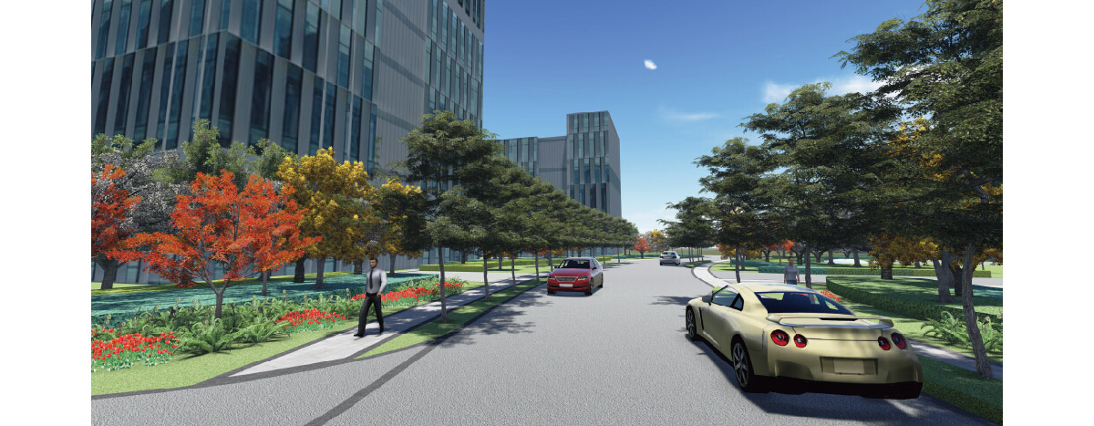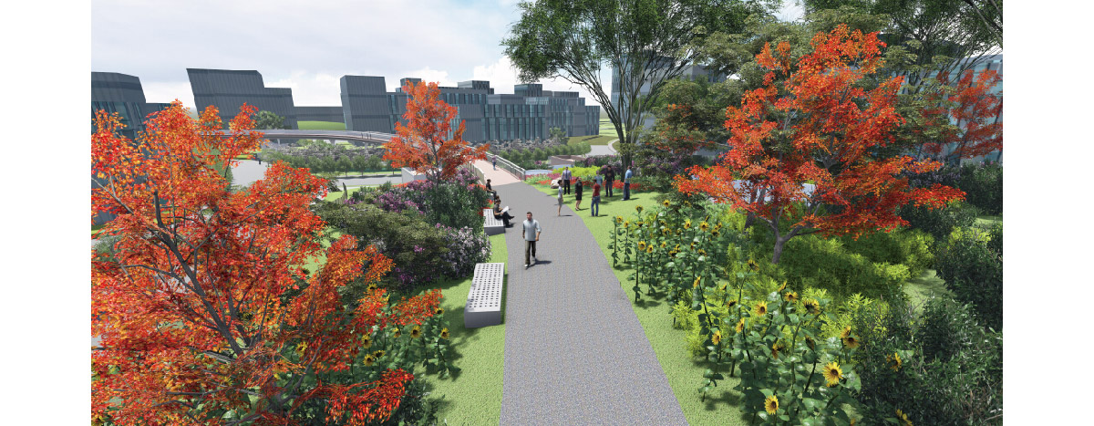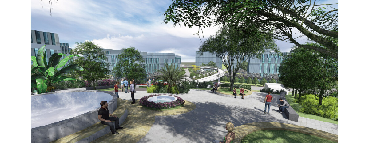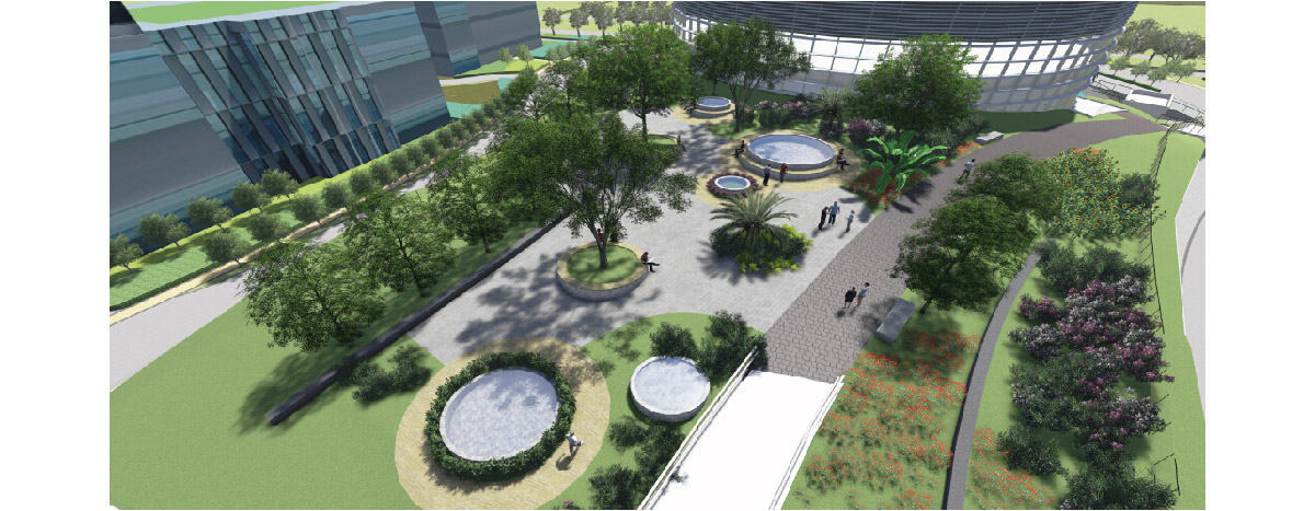 项目通过景观调和,使建筑、景观、与周边环境融为一体,设置独特的交流互动场所,营造能激发员工创造力的休憩空间,以打造一个充满生机的绿色办公环境为目标。