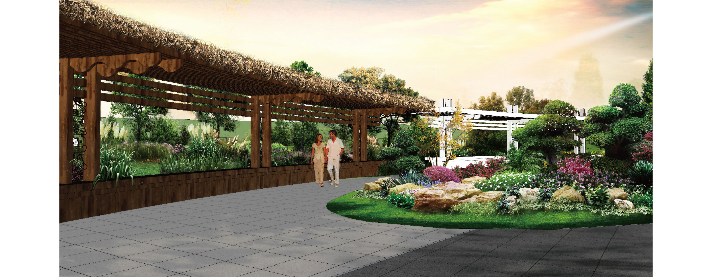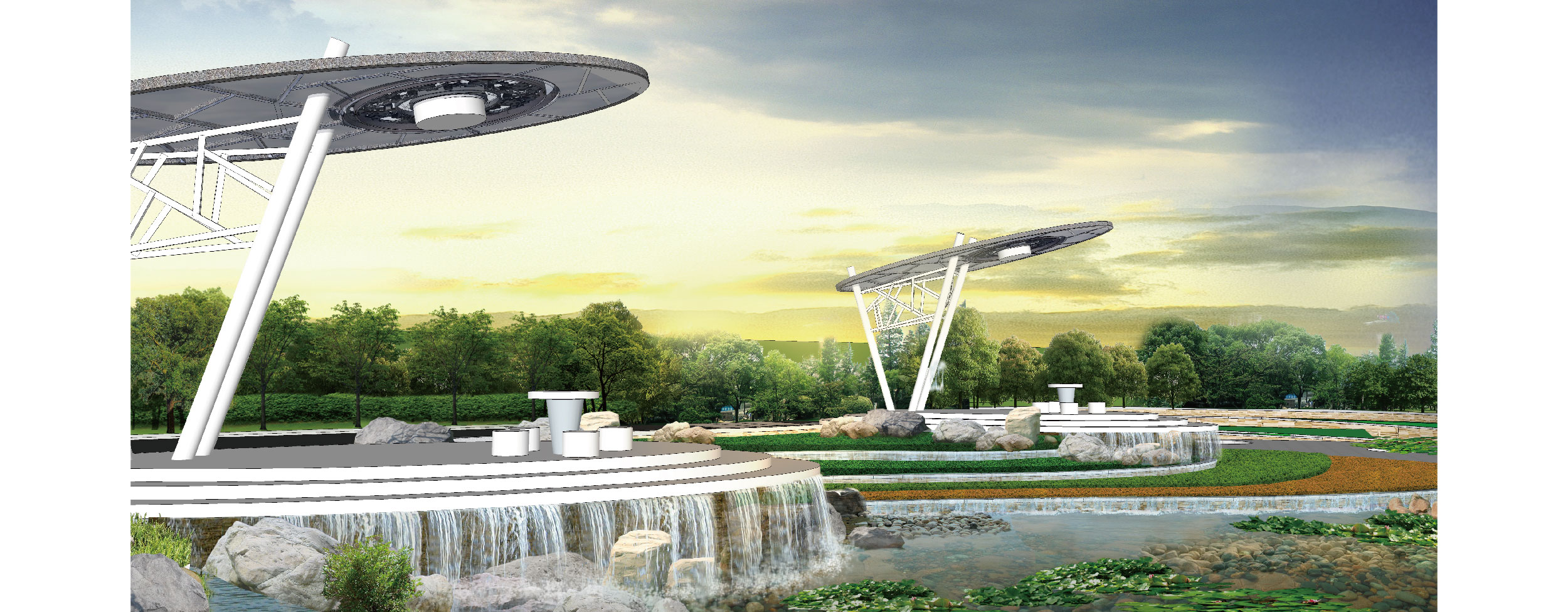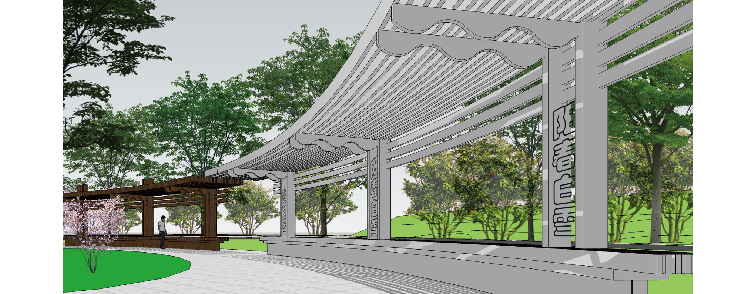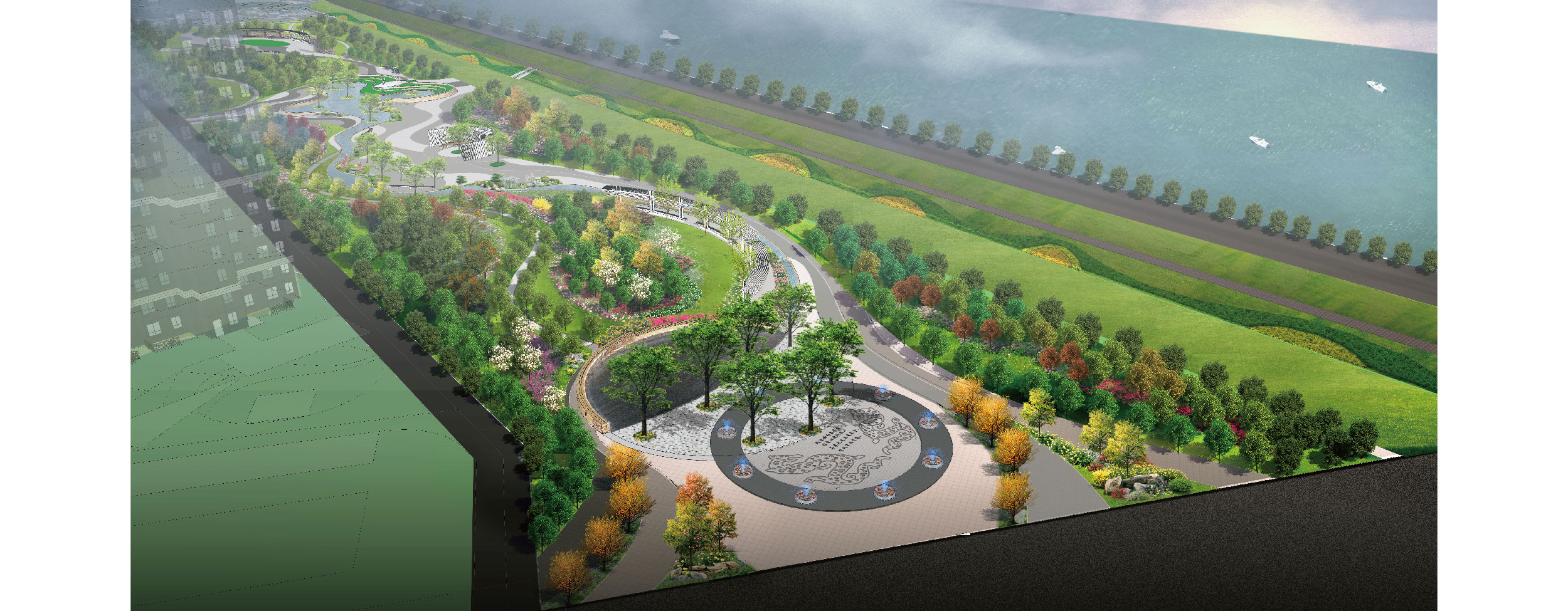 宋玉公园总平面形似如意,以阳春白雪和下里巴人为设计主题,通过地面线刻、溪流、叠水等行云流水般的动感景观,体现出公园的文化内涵。