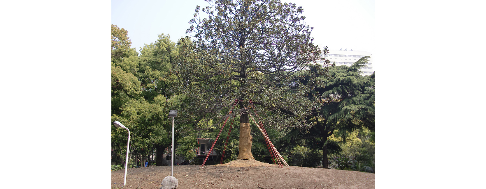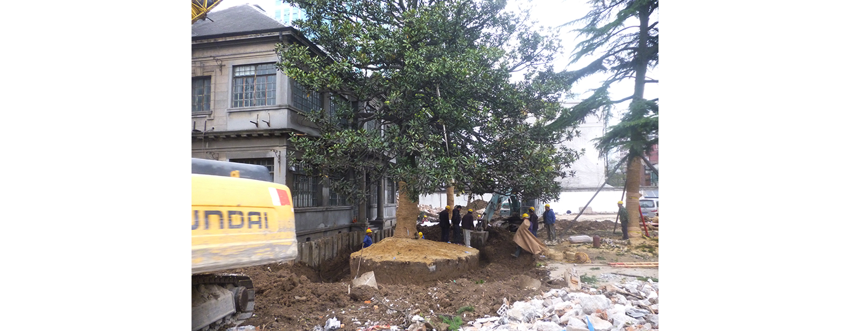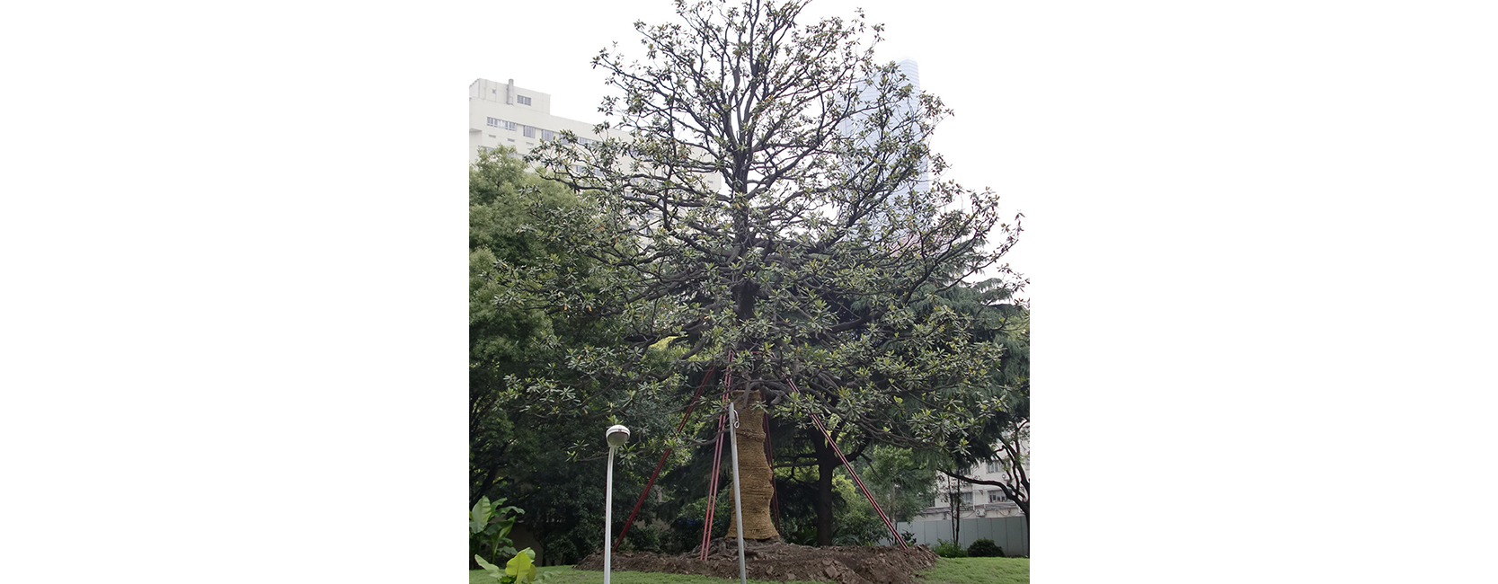 编号为0739、0740古广玉兰和06-031雪松后续资源,位于上海华东医院图书馆南侧绿地内。三株古树经过百年的成长均已长成15米多高的古树,枝叶茂盛,蓬形均有12—15米,胸径达到90cm。 由于古树北侧离图书馆只有3.7米的距离,根系离图书馆水泥道路仅有1.7米,生长坏境过于狭小,且地势过低,易产生积水,土壤长期处于潮湿坏境中,导致古树根系腐烂,此区域已不适于古树的后续生长。为了古树今后更好的生长以及保护,经过相关部门和古树专家的专题研究,根据《上海市古树名木和古树后续资源保护条例》相关要求,决定将三株古树全冠平移至华东医院南花园内。 我司遵循科学原则,在对古树进行充分评估和完备的复壮保护措施后,使用“垂直吊装复合灯笼法”和托底平台相结合的方式将三株古树安全、完好、顺利地移到了新址。现在,移植后的古树在新址生长空间更加广阔了,枝叶更丰满了,展现出更加迷人的风采。