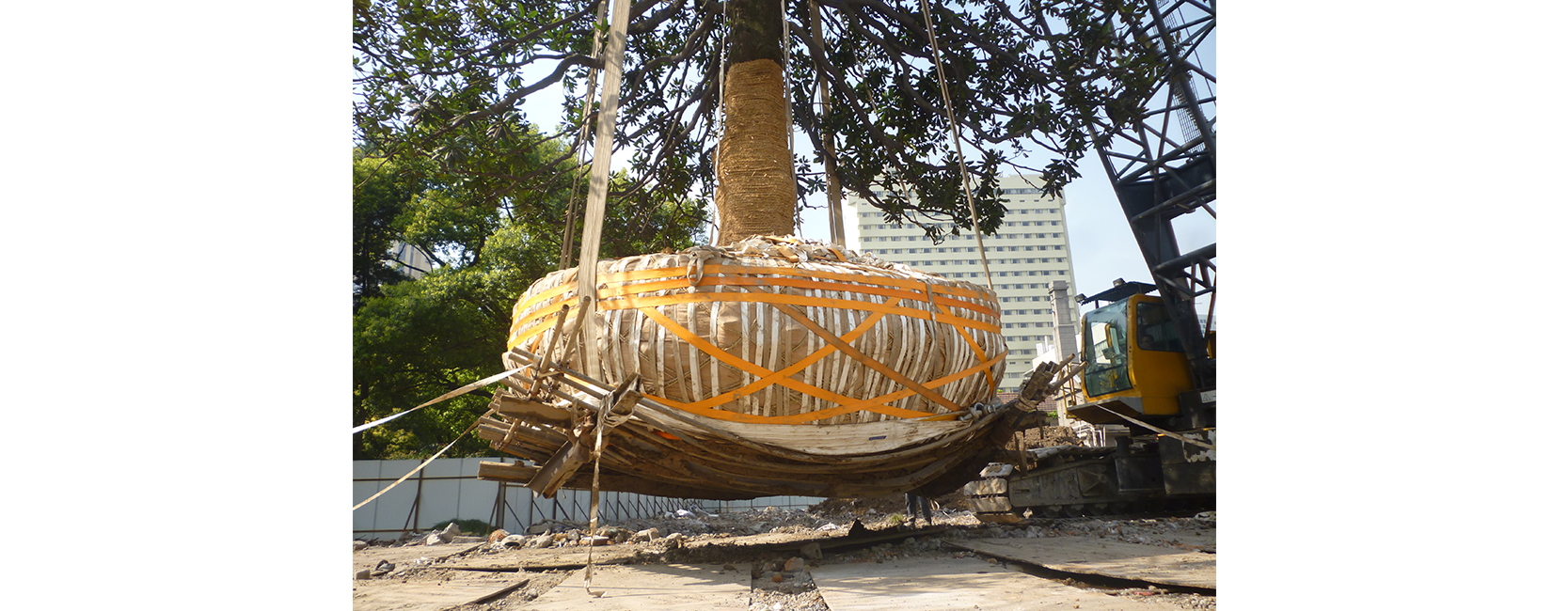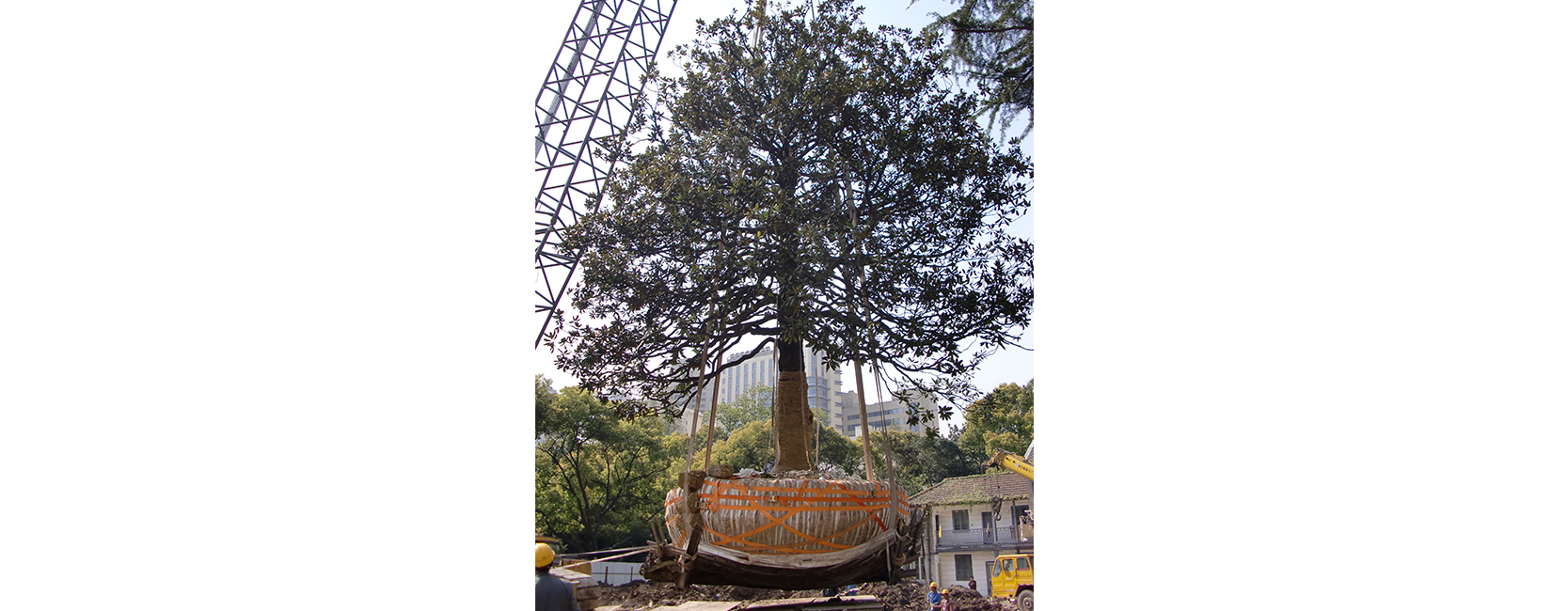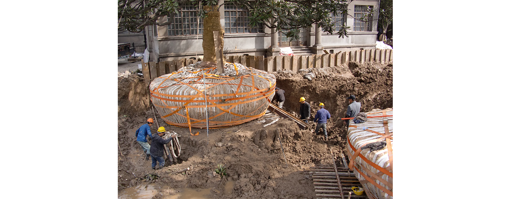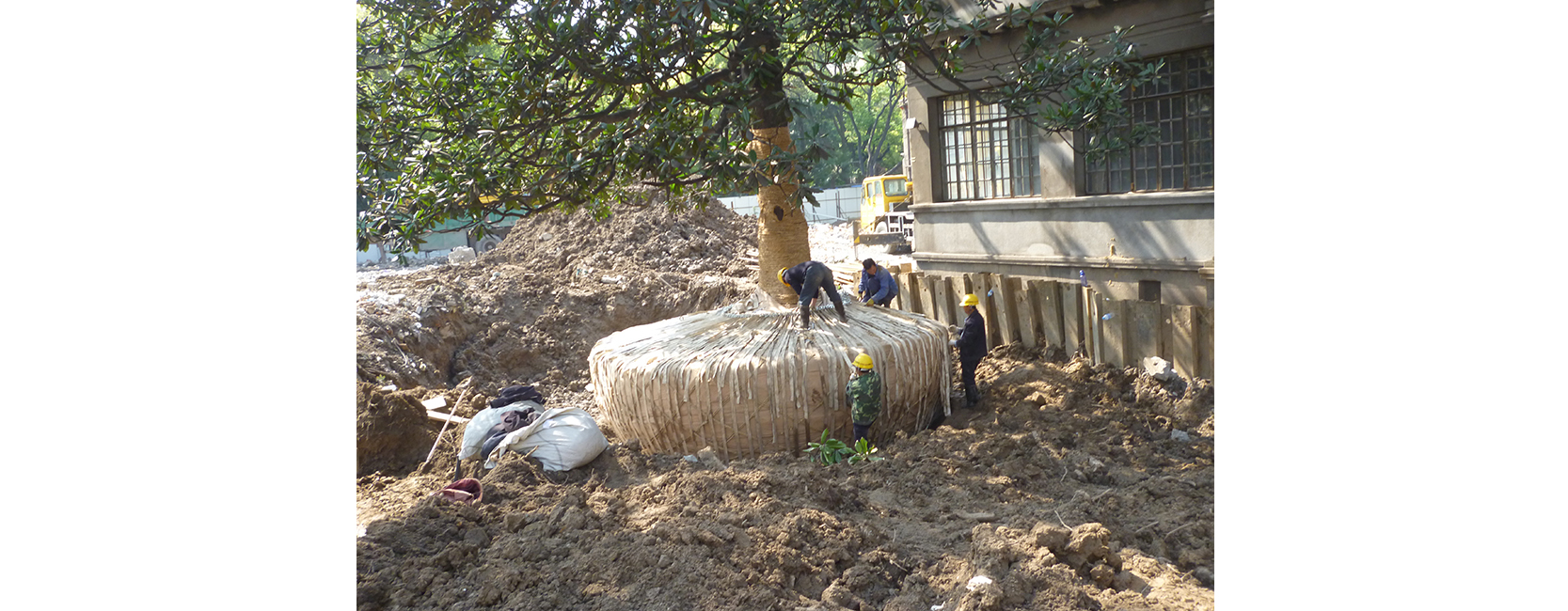 编号为0739、0740古广玉兰和06-031雪松后续资源,位于上海华东医院图书馆南侧绿地内。三株古树经过百年的成长均已长成15米多高的古树,枝叶茂盛,蓬形均有12—15米,胸径达到90cm。 由于古树北侧离图书馆只有3.7米的距离,根系离图书馆水泥道路仅有1.7米,生长坏境过于狭小,且地势过低,易产生积水,土壤长期处于潮湿坏境中,导致古树根系腐烂,此区域已不适于古树的后续生长。为了古树今后更好的生长以及保护,经过相关部门和古树专家的专题研究,根据《上海市古树名木和古树后续资源保护条例》相关要求,决定将三株古树全冠平移至华东医院南花园内。 我司遵循科学原则,在对古树进行充分评估和完备的复壮保护措施后,使用“垂直吊装复合灯笼法”和托底平台相结合的方式将三株古树安全、完好、顺利地移到了新址。现在,移植后的古树在新址生长空间更加广阔了,枝叶更丰满了,展现出更加迷人的风采。