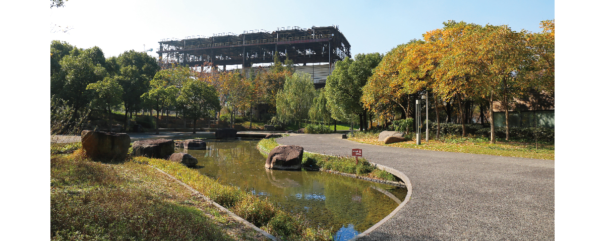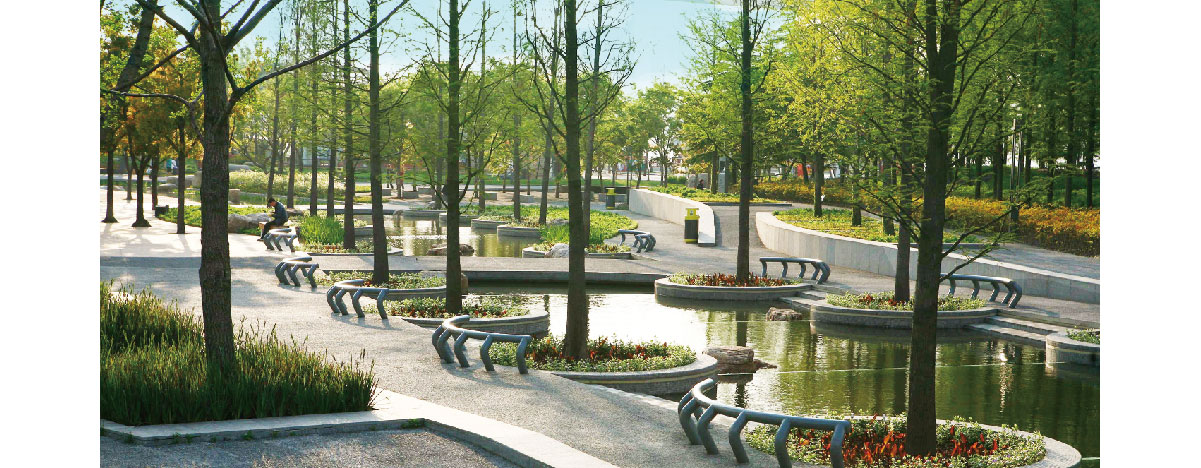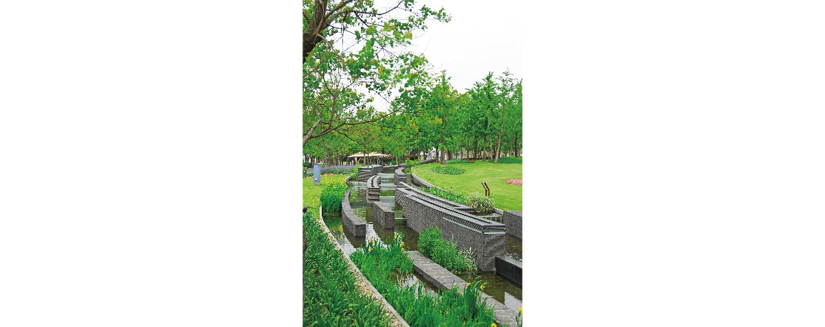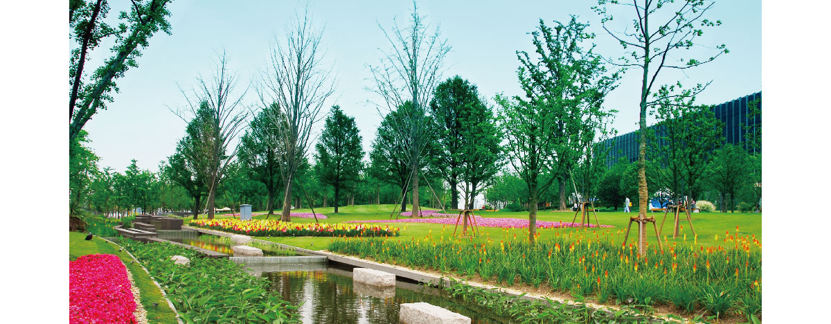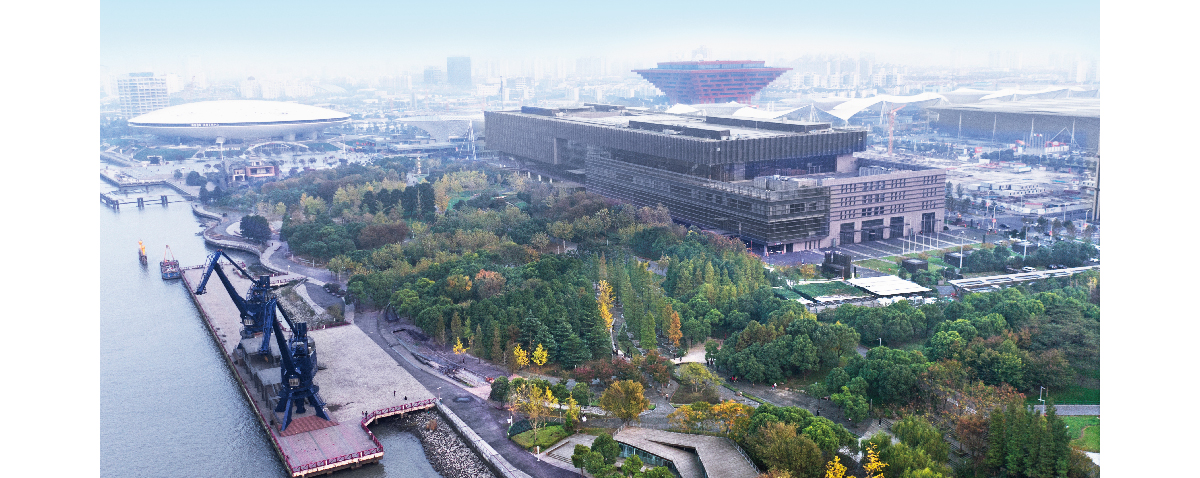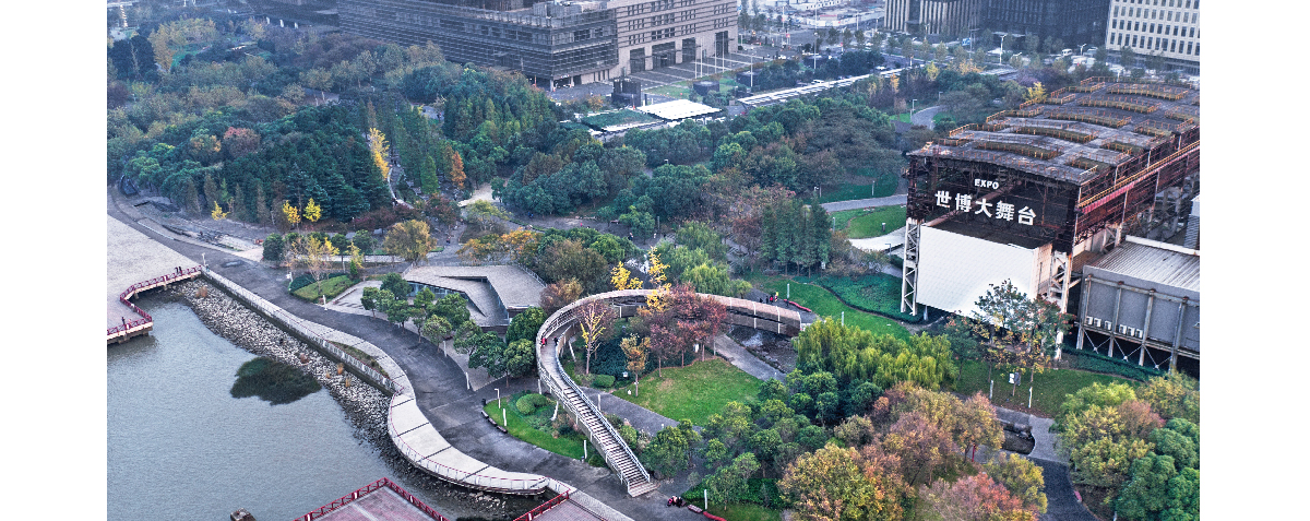 世博公园位于上海中心城区,是自然生态功能与城市人文景观结合的代表作,展开的扇形布局,体现了上海“海纳百川、追求卓越、开明睿智、大气谦和”的城市精神。