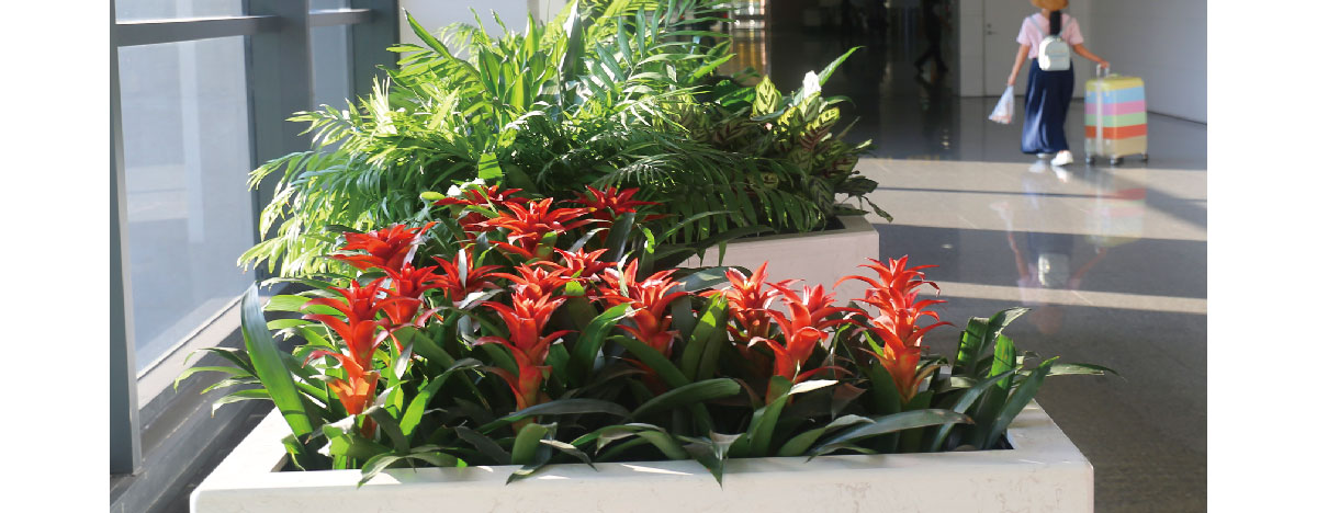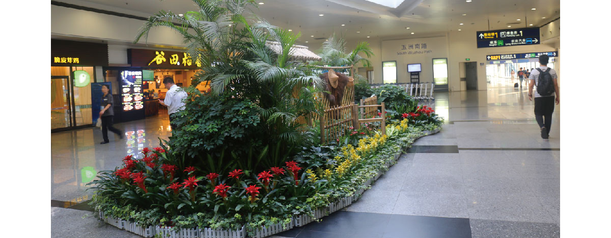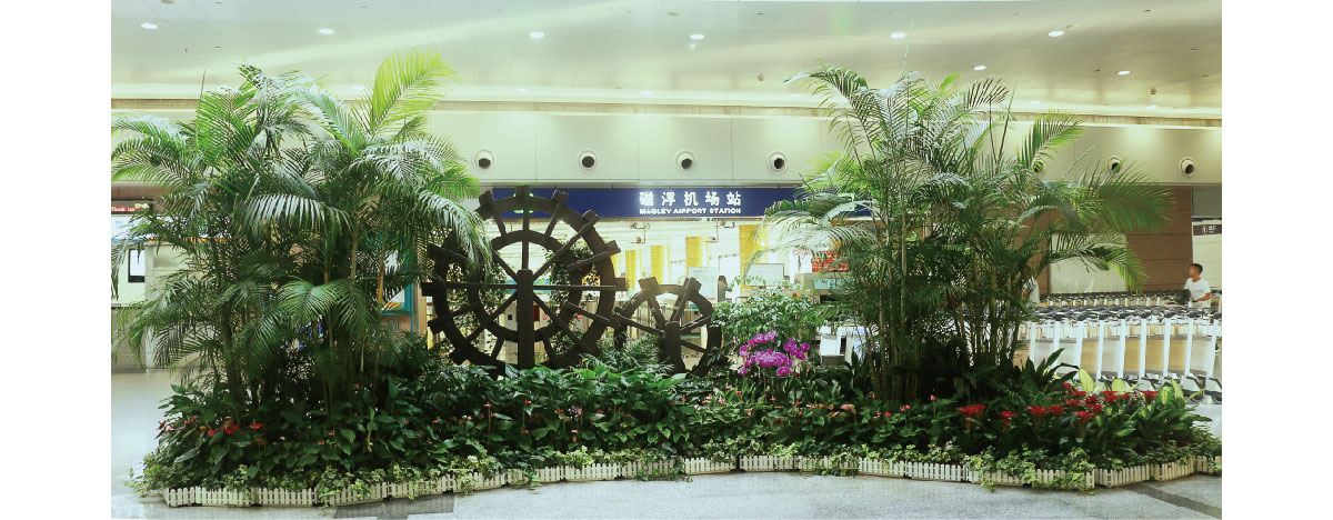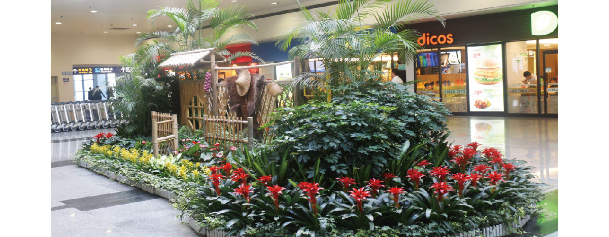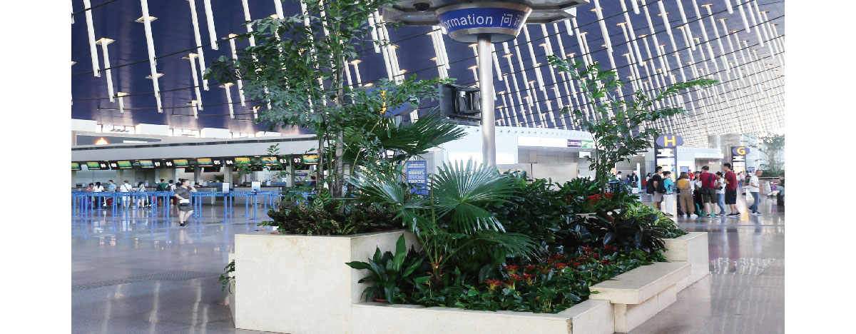 上海浦东国际机场是上海向全国、向世界展示城市形象的一个重要窗口,室内绿化装饰提升了空间的舒适和美感,增添了环境的情趣和艺术,使机场内生机盎然,妙趣横生,成为点睛之作。