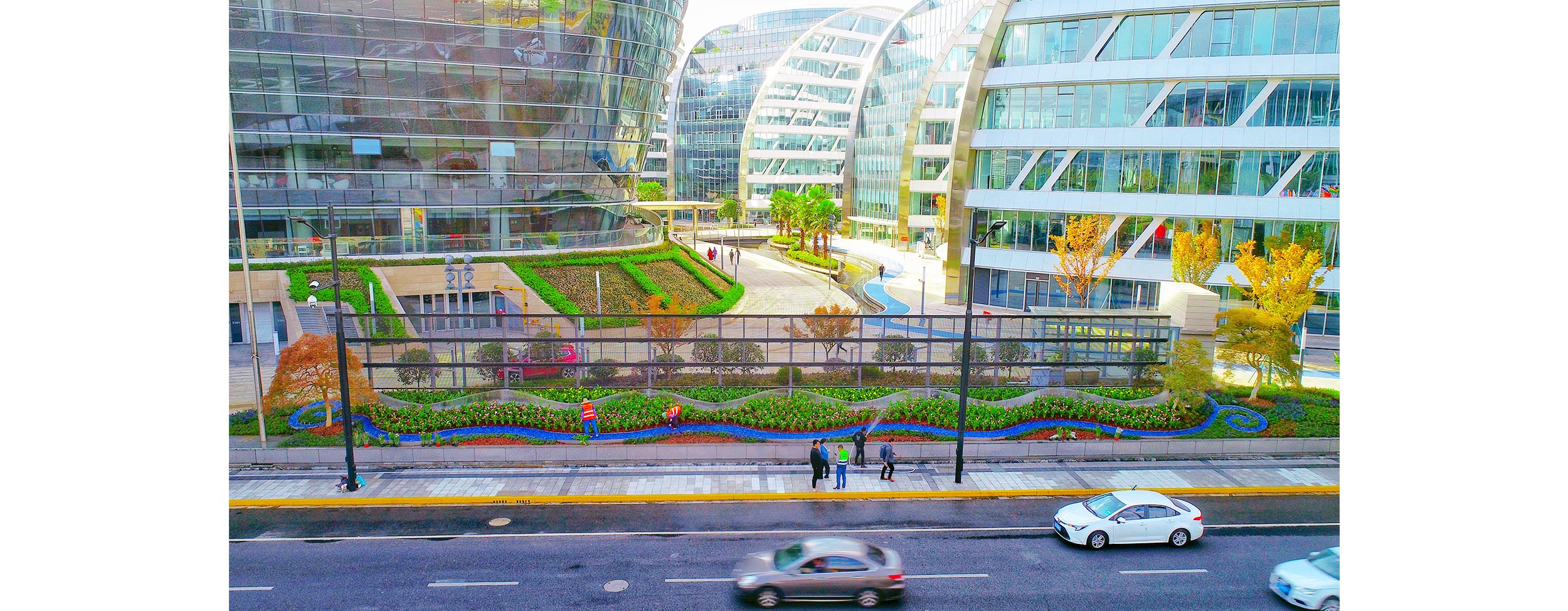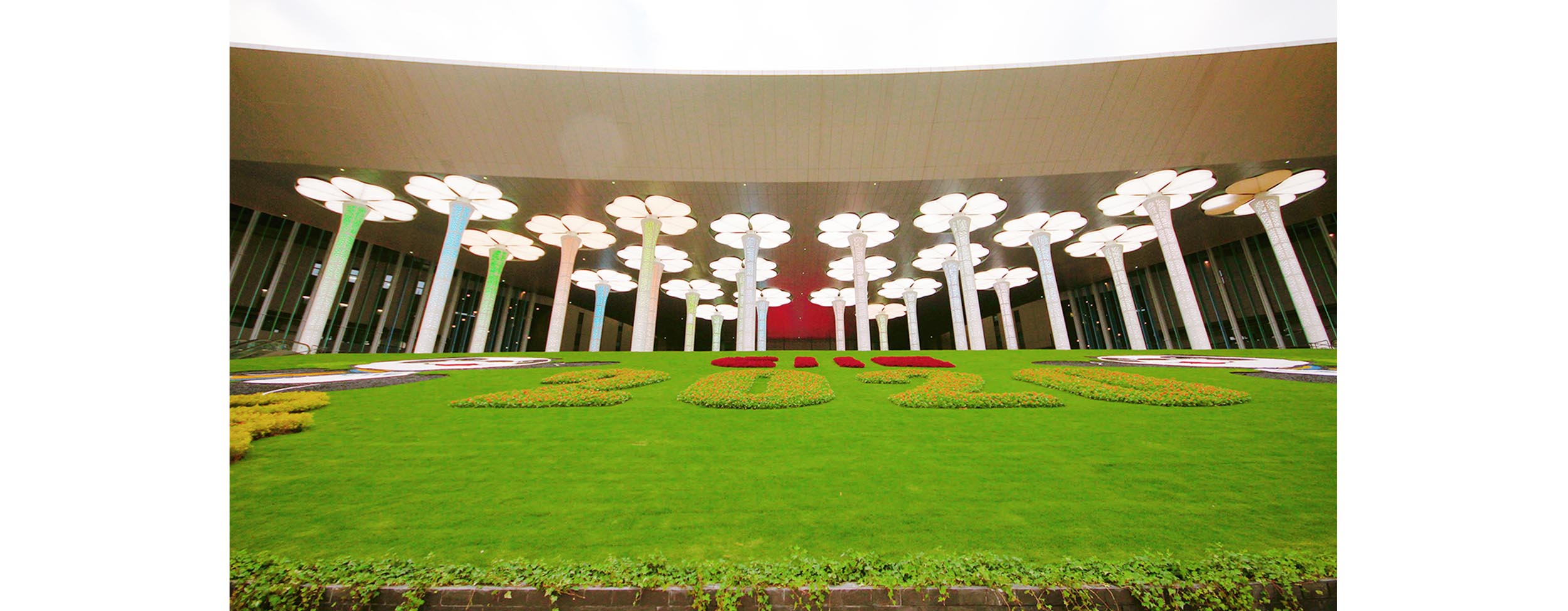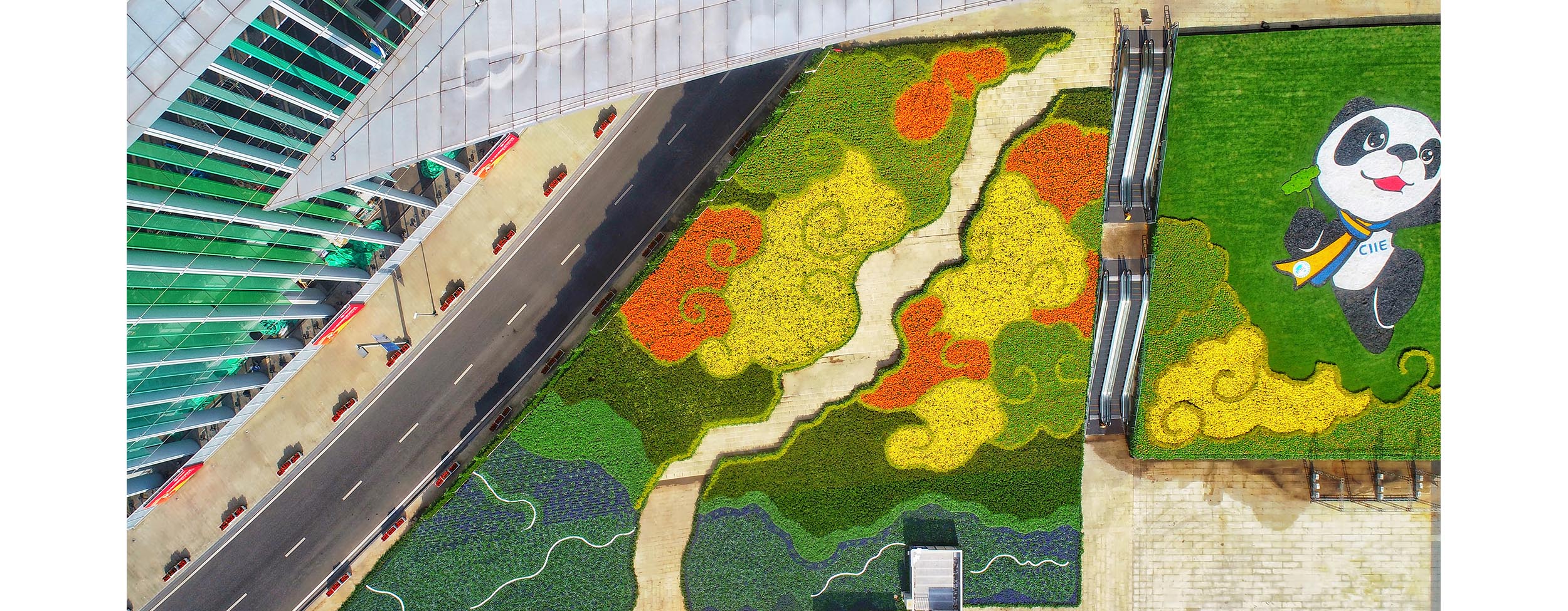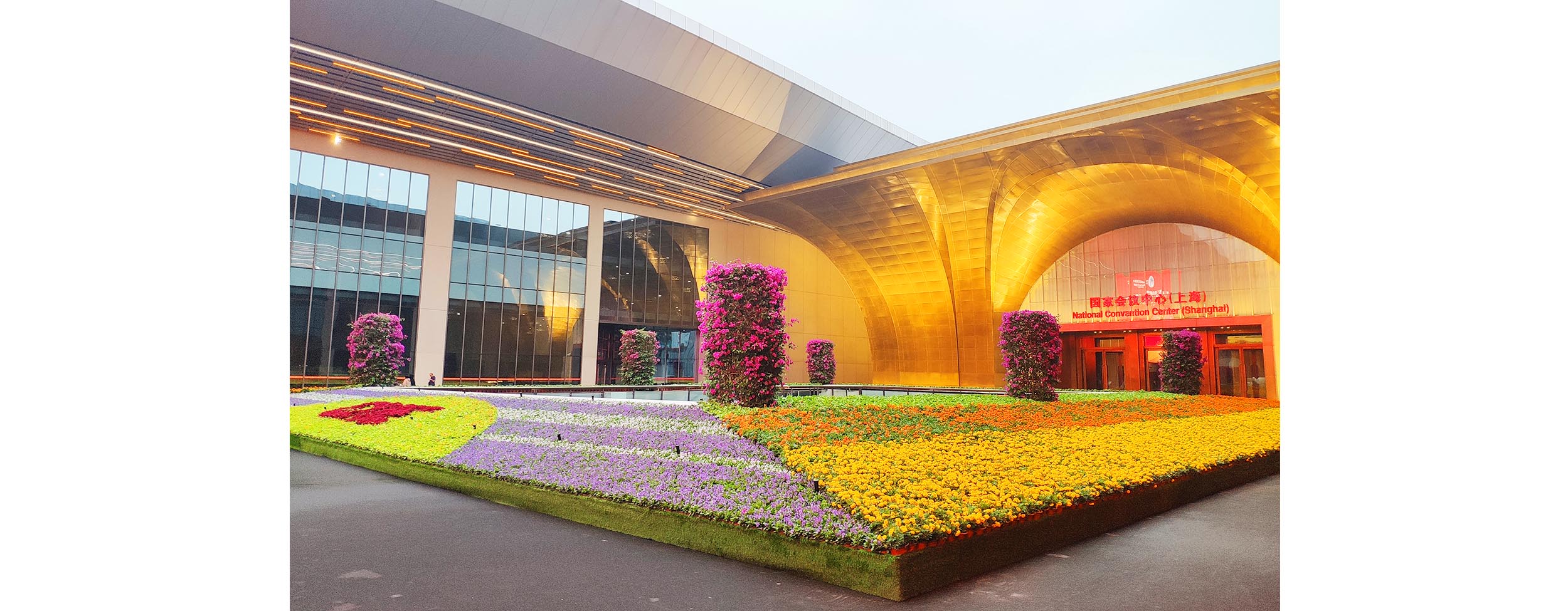 项目主题为海纳百川,共享未来,寓意为上海以激流勇进和大气包容的态度,以焕然一新的面貌,邀请众国齐聚一场盛会,共筑繁荣未来。 南广场部分项目内容包括:特色装饰柱、现代城市花园、景观水池、梯田花海、中央步道、旗阵、台阶种植及吉祥物。以自上而下的“云山—梯田花海—河流—现代城市花园”四个空间脉络,360度显示中国锦绣缤纷的自然之美,体现传统与现代的对话。 西厅部分项目内容包括LOGO标识 、花卉种植、迎宾入口花径和阵列乔木。两侧通过布置阵列的箱栽乔木突出庄重感和仪式感,同时界定景观空间。 花卉植物以蓝紫色为基调(维多利亚鼠尾草、蓝紫色角堇等),辅以体现金秋的金黄色草花(向日葵、孔雀草、百日草等),另外结合少量蓝色调的再生玻璃等非植物材料,体现可持续的环保理念。 迷宫花园中的八根立柱采用两层同心圆的设计,内层采用色彩渐变的灯柱,外层为镂空金属板,雕刻参展国的名称,夜晚内置灯的投射下,映照出分别以30个参展国文字雕刻着的“您好”的欢迎标语,呈现丰富、互动的夜景效果,寓意着上海欢迎世界各地齐聚的包容性、进博会的国际化,呼应整个主题。 公司举全体之力,组织安排、整体保障,营造上海城市新形象、新风貌。力争体现行业“最高标准、最佳水平”,确保第三届进口博览会举办圆满成功。 |